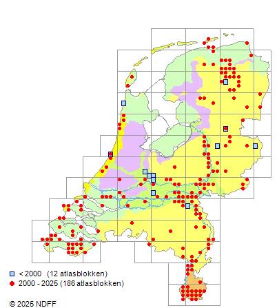 Het aantal atlasblokken (5x5 km) waarin de soort is gemeld binnen een periode van vijf jaar (vanaf 1980) of twintig jaar.