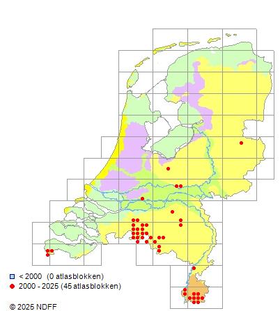 Het aantal atlasblokken (5x5 km) waarin de soort is gemeld binnen een periode van vijf jaar (vanaf 1980) of twintig jaar. Niet gecorrigeerd voor waarnemersinspanning en het aantal doorgegeven waarnemingen kan sterk variëren per periode, dus een trend in verspreiding kan hier niet direct uit worden afgelezen. Het opgegeven jaartal is het eerste jaar van de periode. Bron: gevalideerde waarnemingen uit de NDFF.