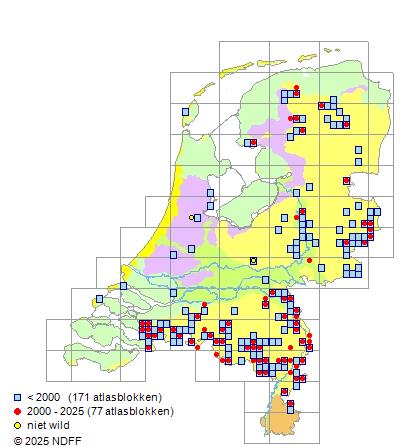 CC BY-NC-SA 3.0 NLVerspreidingNederlandZeldzaam in Noord-Brabant en Noord-Limburg en zeer zeldzaam elders in het oosten en midden van het land en op Texel.