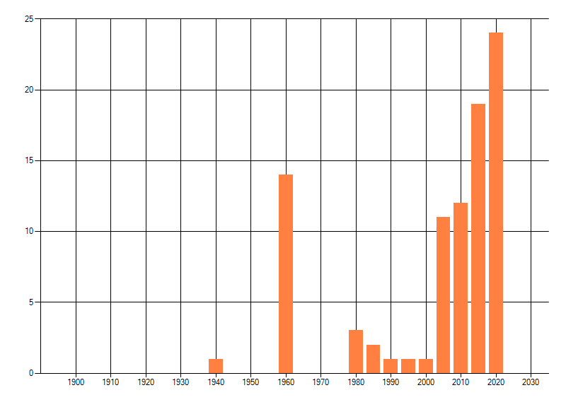 Het aantal atlasblokken (5x5 km) waarin de soort is gemeld binnen een periode van vijf jaar (vanaf 1980) of twintig jaar. Niet gecorrigeerd voor waarnemersinspanning en het aantal doorgegeven waarnemingen kan sterk variëren per periode, dus een trend in verspreiding kan hier niet direct uit worden afgelezen. Het opgegeven jaartal is het eerste jaar van de periode. Bron: gevalideerde waarnemingen uit de NDFF.