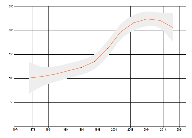 Gemiddelde trend van het aantal kilometerhokken waarin de soort voorkomt, weergegeven als indexcijfer (1975-1978 = 100). De trend is gecorrigeerd voor waarnemersinspanning en geeft de relatieve verandering in het aantal bezette kilometerhokken weer. Voor de berekening worden de data per periode van vier jaar samengenomen. In de grafiek correspondeert ieder punt met het laatste jaar van zo'n periode.