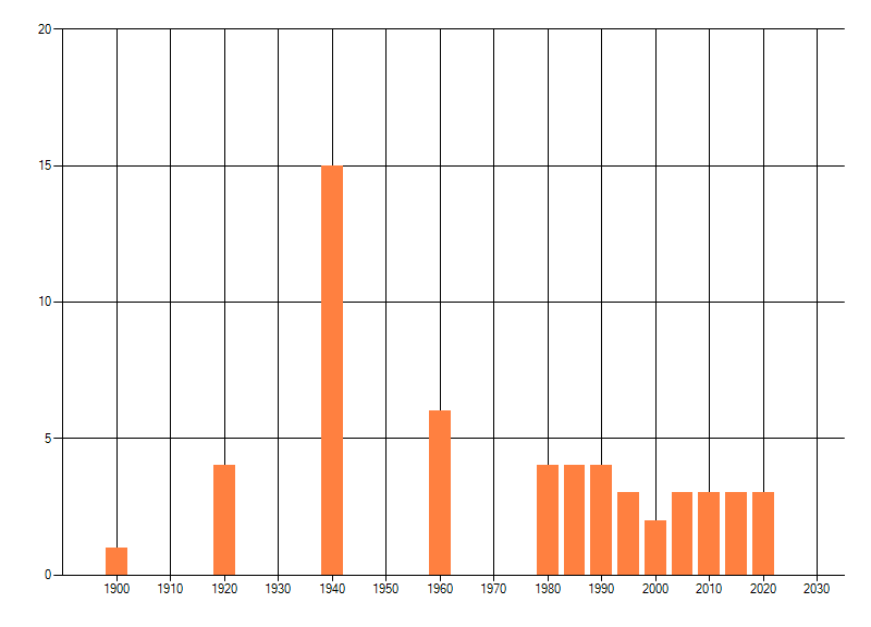 Het aantal atlasblokken (5x5 km) waarin de soort is gemeld binnen een periode van vijf jaar (vanaf 1980) of twintig jaar. Niet gecorrigeerd voor waarnemersinspanning en het aantal doorgegeven waarnemingen kan sterk variëren per periode, dus een trend in verspreiding kan hier niet direct uit worden afgelezen. Het opgegeven jaartal is het eerste jaar van de periode. Bron: gevalideerde waarnemingen uit de NDFF.