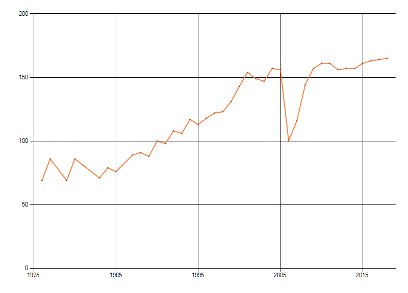 In de grafiek correspondeert ieder punt met het laatste jaar van zo'n periode.