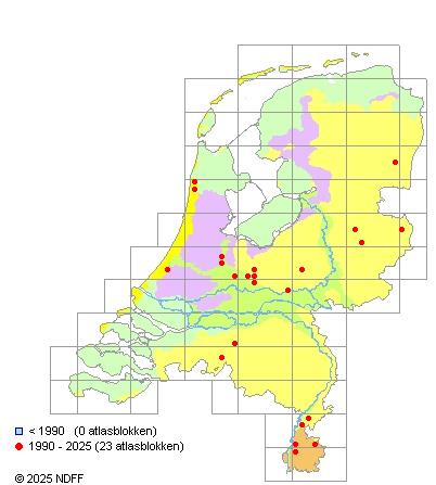 Het aantal atlasblokken (5x5 km) waarin de soort is gemeld binnen een periode van vijf jaar (vanaf 1980) of twintig jaar.