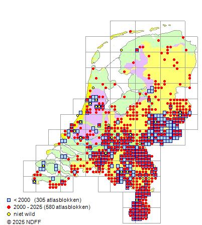 CC BY-NC-SA 3.0 NLVerspreidingNederlandZeldzaam, maar in het zuiden en oosten van het land plaatselijk vrij algemeen.