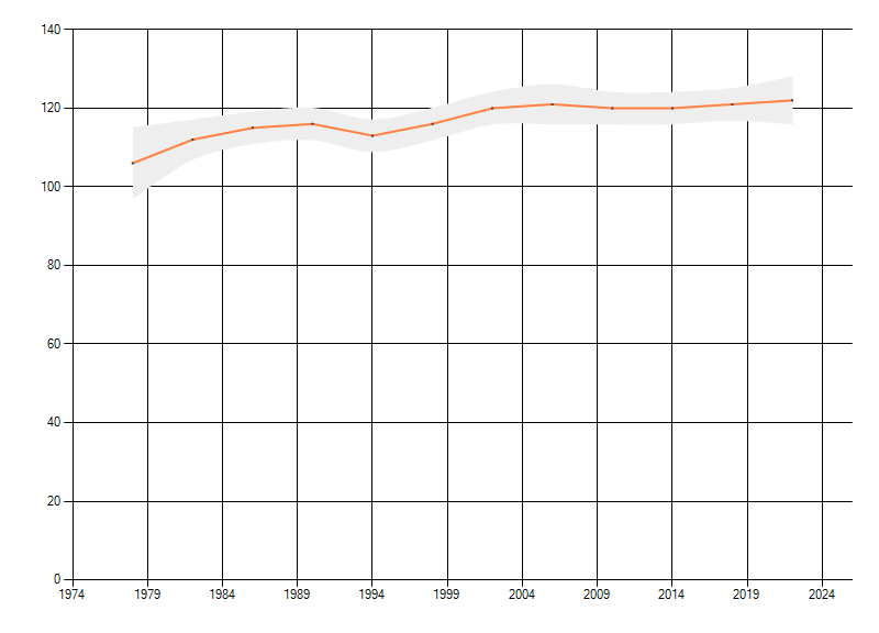 Gemiddelde trend van het aantal kilometerhokken waarin de soort voorkomt, weergegeven als indexcijfer (1975-1978 = 100).