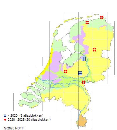 Het aantal atlasblokken (5x5 km) waarin de soort is gemeld binnen een periode van vijf jaar (vanaf 1980) of twintig jaar. Niet gecorrigeerd voor waarnemersinspanning en het aantal doorgegeven waarnemingen kan sterk variëren per periode, dus een trend in verspreiding kan hier niet direct uit worden afgelezen. Het opgegeven jaartal is het eerste jaar van de periode. Bron: gevalideerde waarnemingen uit de NDFF.