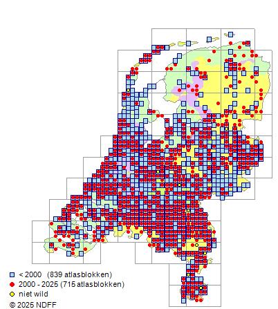 CC BY-NC-SA 3.0 NLVerspreidingNederlandVrij algemeen in de Hollandse en Zeeuwse duinen. Elders plaatselijk vrij algemeen, maar zeldzaam tot zeer zeldzaam in het noorden, in Zeeland en in Zuid-Limburg.