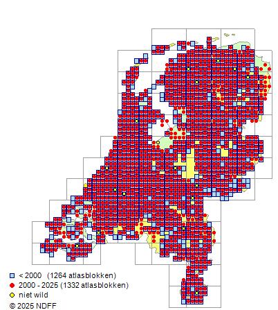 CC BY-NC-SA 3.0 NLVerspreidingNederlandAlgemeen in laagveengebieden, het noordelijk zeekleigeied, het rivierengebied en op de Waddeneilanden. Elders plaatselijk vrij algemeen, maar vrij zeldzaam in het Deltagebied, op de hoge zandgronden en in Zuid-Limburg.