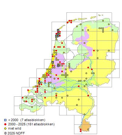 Het aantal atlasblokken (5x5 km) waarin de soort is gemeld binnen een periode van vijf jaar (vanaf 1980) of twintig jaar. Niet gecorrigeerd voor waarnemersinspanning en het aantal doorgegeven waarnemingen kan sterk variëren per periode, dus een trend in verspreiding kan hier niet direct uit worden afgelezen. Het opgegeven jaartal is het eerste jaar van de periode. Bron: gevalideerde waarnemingen uit de NDFF.