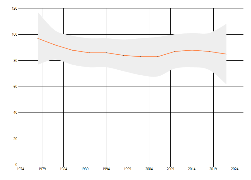 Gemiddelde trend van het aantal kilometerhokken waarin de soort voorkomt, weergegeven als indexcijfer (1975-1978 = 100).