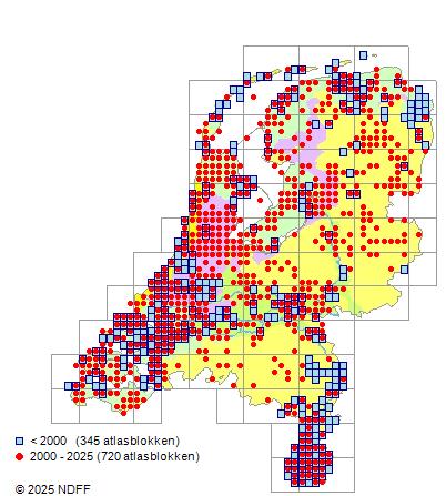 Het aantal atlasblokken (5x5 km) waarin de soort is gemeld binnen een periode van vijf jaar (vanaf 1980) of twintig jaar. Niet gecorrigeerd voor waarnemersinspanning en het aantal doorgegeven waarnemingen kan sterk variëren per periode, dus een trend in verspreiding kan hier niet direct uit worden afgelezen. Het opgegeven jaartal is het eerste jaar van de periode. Bron: gevalideerde waarnemingen uit de NDFF.