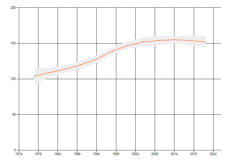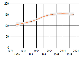 Gemiddelde trend van het aantal kilometerhokken waarin de soort voorkomt, weergegeven als indexcijfer (1975-1978 = 100).