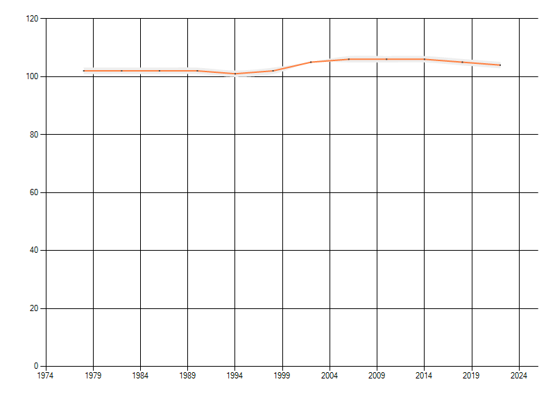 Gemiddelde trend van het aantal kilometerhokken waarin de soort voorkomt, weergegeven als indexcijfer (1975-1978 = 100). De trend is gecorrigeerd voor waarnemersinspanning en geeft de relatieve verandering in het aantal bezette kilometerhokken weer. Voor de berekening worden de data per periode van vier jaar samengenomen. In de grafiek correspondeert ieder punt met het laatste jaar van zo'n periode.