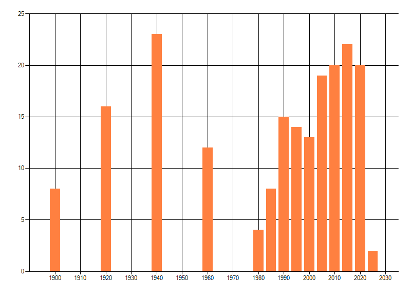 Het aantal atlasblokken (5x5 km) waarin de soort is gemeld binnen een periode van vijf jaar (vanaf 1980) of twintig jaar. Niet gecorrigeerd voor waarnemersinspanning en het aantal doorgegeven waarnemingen kan sterk variëren per periode, dus een trend in verspreiding kan hier niet direct uit worden afgelezen. Het opgegeven jaartal is het eerste jaar van de periode. Bron: gevalideerde waarnemingen uit de NDFF.