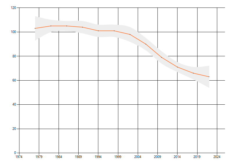 Gemiddelde trend van het aantal kilometerhokken waarin de soort voorkomt, weergegeven als indexcijfer (1975-1978 = 100). De trend is gecorrigeerd voor waarnemersinspanning en geeft de relatieve verandering in het aantal bezette kilometerhokken weer. Voor de berekening worden de data per periode van vier jaar samengenomen. In de grafiek correspondeert ieder punt met het laatste jaar van zo'n periode.