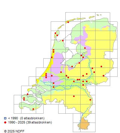 Het aantal atlasblokken (5x5 km) waarin de soort is gemeld binnen een periode van vijf jaar (vanaf 1980) of twintig jaar. Niet gecorrigeerd voor waarnemersinspanning en het aantal doorgegeven waarnemingen kan sterk variëren per periode, dus een trend in verspreiding kan hier niet direct uit worden afgelezen. Het opgegeven jaartal is het eerste jaar van de periode. Bron: gevalideerde waarnemingen uit de NDFF.