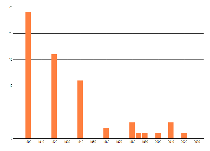 Het aantal atlasblokken (5x5 km) waarin de soort is gemeld binnen een periode van vijf jaar (vanaf 1980) of twintig jaar. Niet gecorrigeerd voor waarnemersinspanning en het aantal doorgegeven waarnemingen kan sterk variëren per periode, dus een trend in verspreiding kan hier niet direct uit worden afgelezen. Het opgegeven jaartal is het eerste jaar van de periode. Bron: gevalideerde waarnemingen uit de NDFF.