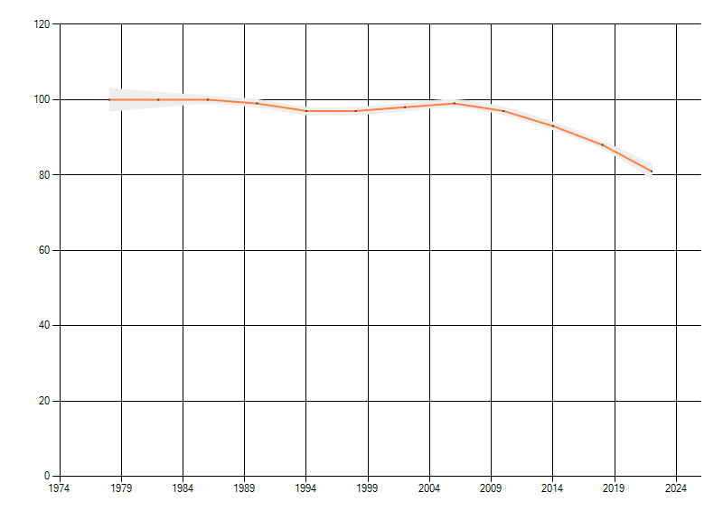 Gemiddelde trend van het aantal kilometerhokken waarin de soort voorkomt, weergegeven als indexcijfer (1975-1978 = 100). De trend is gecorrigeerd voor waarnemersinspanning en geeft de relatieve verandering in het aantal bezette kilometerhokken weer. Voor de berekening worden de data per periode van vier jaar samengenomen. In de grafiek correspondeert ieder punt met het laatste jaar van zo'n periode.