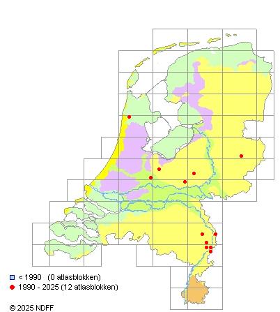 Het aantal atlasblokken (5x5 km) waarin de soort is gemeld binnen een periode van vijf jaar (vanaf 1980) of twintig jaar. Niet gecorrigeerd voor waarnemersinspanning en het aantal doorgegeven waarnemingen kan sterk variëren per periode, dus een trend in verspreiding kan hier niet direct uit worden afgelezen. Het opgegeven jaartal is het eerste jaar van de periode. Bron: gevalideerde waarnemingen uit de NDFF.