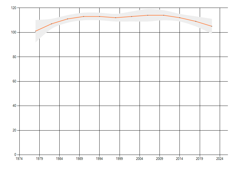 Gemiddelde trend van het aantal kilometerhokken waarin de soort voorkomt, weergegeven als indexcijfer (1975-1978 = 100).