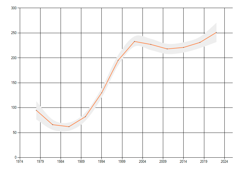 Gemiddelde trend van het aantal kilometerhokken waarin de soort voorkomt, weergegeven als indexcijfer (1975-1978 = 100).