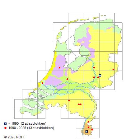 Het aantal atlasblokken (5x5 km) waarin de soort is gemeld binnen een periode van vijf jaar (vanaf 1980) of twintig jaar. Niet gecorrigeerd voor waarnemersinspanning en het aantal doorgegeven waarnemingen kan sterk variëren per periode, dus een trend in verspreiding kan hier niet direct uit worden afgelezen. Het opgegeven jaartal is het eerste jaar van de periode. Bron: gevalideerde waarnemingen uit de NDFF.