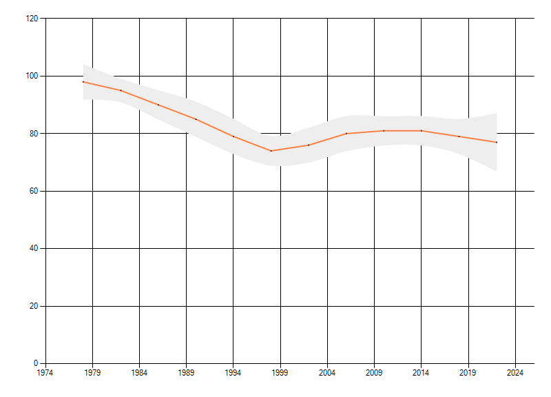 Gemiddelde trend van het aantal kilometerhokken waarin de soort voorkomt, weergegeven als indexcijfer (1975-1978 = 100). De trend is gecorrigeerd voor waarnemersinspanning en geeft de relatieve verandering in het aantal bezette kilometerhokken weer. Voor de berekening worden de data per periode van vier jaar samengenomen. In de grafiek correspondeert ieder punt met het laatste jaar van zo'n periode.