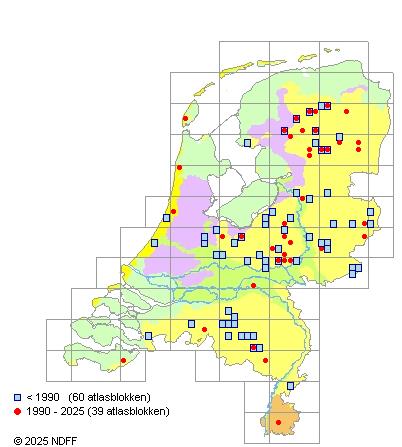 Het aantal atlasblokken (5x5 km) waarin de soort is gemeld binnen een periode van vijf jaar (vanaf 1980) of twintig jaar. Niet gecorrigeerd voor waarnemersinspanning en het aantal doorgegeven waarnemingen kan sterk variëren per periode, dus een trend in verspreiding kan hier niet direct uit worden afgelezen. Het opgegeven jaartal is het eerste jaar van de periode. Bron: gevalideerde waarnemingen uit de NDFF.