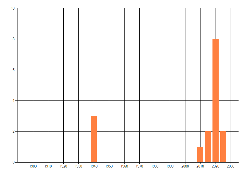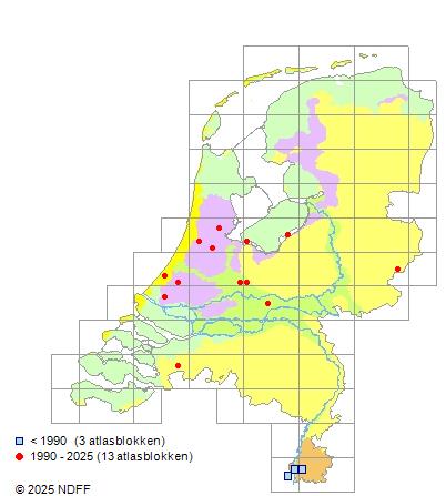 Het aantal atlasblokken (5x5 km) waarin de soort is gemeld binnen een periode van vijf jaar (vanaf 1980) of twintig jaar. Niet gecorrigeerd voor waarnemersinspanning en het aantal doorgegeven waarnemingen kan sterk variëren per periode, dus een trend in verspreiding kan hier niet direct uit worden afgelezen. Het opgegeven jaartal is het eerste jaar van de periode. Bron: gevalideerde waarnemingen uit de NDFF.