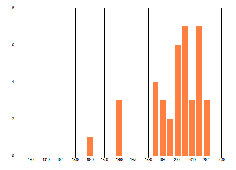 Het aantal atlasblokken (5x5 km) waarin de soort is gemeld binnen een periode van vijf jaar (vanaf 1980) of twintig jaar. Niet gecorrigeerd voor waarnemersinspanning en het aantal doorgegeven waarnemingen kan sterk variëren per periode, dus een trend in verspreiding kan hier niet direct uit worden afgelezen. Het opgegeven jaartal is het eerste jaar van de periode. Bron: gevalideerde waarnemingen uit de NDFF.