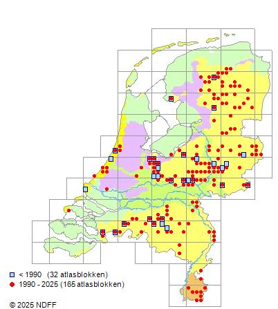 Het aantal atlasblokken (5x5 km) waarin de soort is gemeld binnen een periode van vijf jaar (vanaf 1980) of twintig jaar. Niet gecorrigeerd voor waarnemersinspanning en het aantal doorgegeven waarnemingen kan sterk variëren per periode, dus een trend in verspreiding kan hier niet direct uit worden afgelezen. Het opgegeven jaartal is het eerste jaar van de periode. Bron: gevalideerde waarnemingen uit de NDFF.