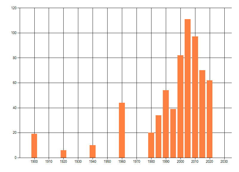 Het aantal atlasblokken (5x5 km) waarin de soort is gemeld binnen een periode van vijf jaar (vanaf 1980) of twintig jaar. Niet gecorrigeerd voor waarnemersinspanning en het aantal doorgegeven waarnemingen kan sterk variëren per periode, dus een trend in verspreiding kan hier niet direct uit worden afgelezen. Het opgegeven jaartal is het eerste jaar van de periode. Bron: gevalideerde waarnemingen uit de NDFF.