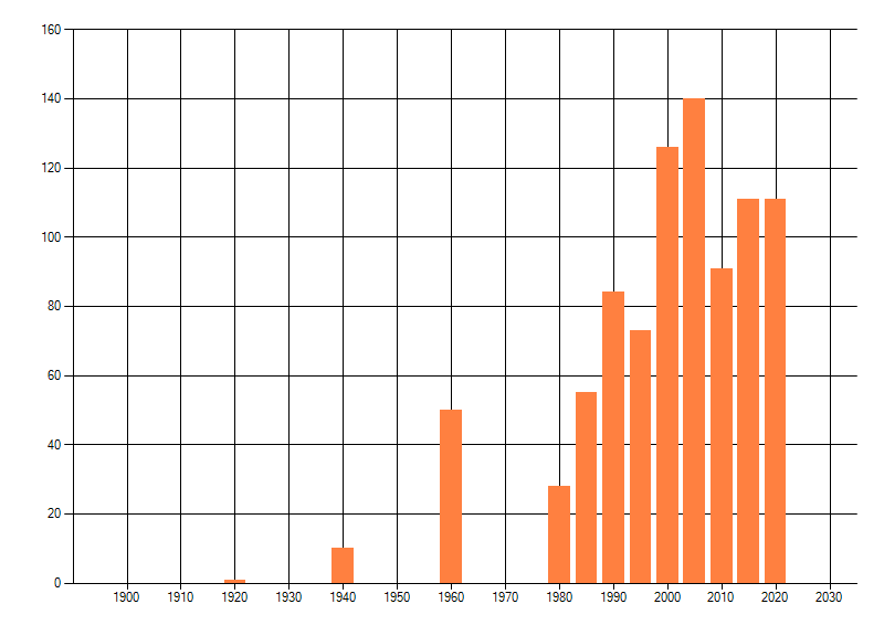 Het aantal atlasblokken (5x5 km) waarin de soort is gemeld binnen een periode van vijf jaar (vanaf 1980) of twintig jaar. Niet gecorrigeerd voor waarnemersinspanning en het aantal doorgegeven waarnemingen kan sterk variëren per periode, dus een trend in verspreiding kan hier niet direct uit worden afgelezen. Het opgegeven jaartal is het eerste jaar van de periode. Bron: gevalideerde waarnemingen uit de NDFF.