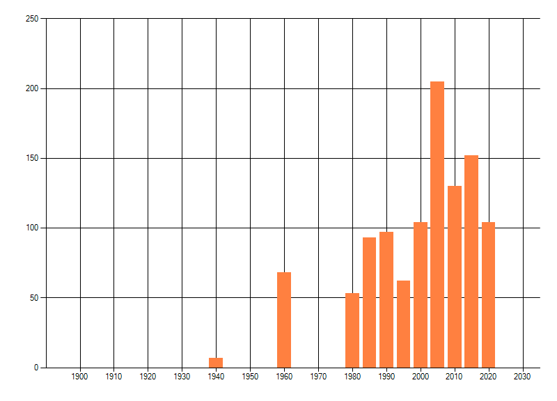 Het aantal atlasblokken (5x5 km) waarin de soort is gemeld binnen een periode van vijf jaar (vanaf 1980) of twintig jaar. Niet gecorrigeerd voor waarnemersinspanning en het aantal doorgegeven waarnemingen kan sterk variëren per periode, dus een trend in verspreiding kan hier niet direct uit worden afgelezen. Het opgegeven jaartal is het eerste jaar van de periode. Bron: gevalideerde waarnemingen uit de NDFF.