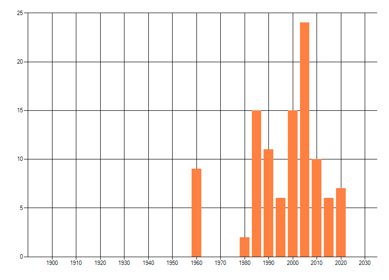 Het aantal atlasblokken (5x5 km) waarin de soort is gemeld binnen een periode van vijf jaar (vanaf 1980) of twintig jaar. Niet gecorrigeerd voor waarnemersinspanning en het aantal doorgegeven waarnemingen kan sterk variëren per periode, dus een trend in verspreiding kan hier niet direct uit worden afgelezen. Het opgegeven jaartal is het eerste jaar van de periode. Bron: gevalideerde waarnemingen uit de NDFF.