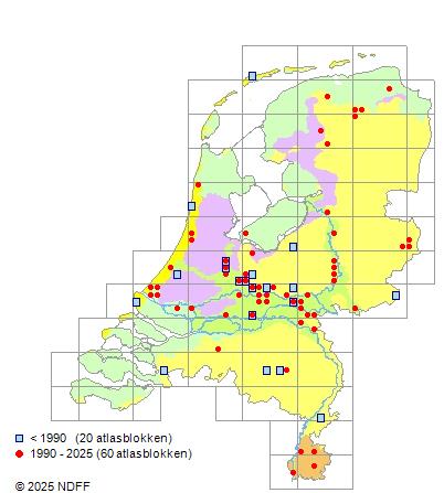 Het aantal atlasblokken (5x5 km) waarin de soort is gemeld binnen een periode van vijf jaar (vanaf 1980) of twintig jaar. Niet gecorrigeerd voor waarnemersinspanning en het aantal doorgegeven waarnemingen kan sterk variëren per periode, dus een trend in verspreiding kan hier niet direct uit worden afgelezen. Het opgegeven jaartal is het eerste jaar van de periode. Bron: gevalideerde waarnemingen uit de NDFF.