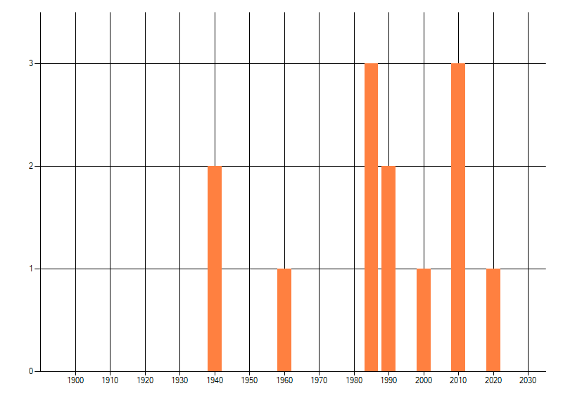 Het aantal atlasblokken (5x5 km) waarin de soort is gemeld binnen een periode van vijf jaar (vanaf 1980) of twintig jaar. Niet gecorrigeerd voor waarnemersinspanning en het aantal doorgegeven waarnemingen kan sterk variëren per periode, dus een trend in verspreiding kan hier niet direct uit worden afgelezen. Het opgegeven jaartal is het eerste jaar van de periode. Bron: gevalideerde waarnemingen uit de NDFF.