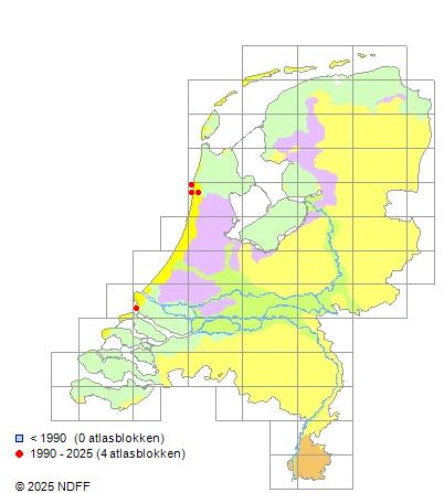 Het aantal atlasblokken (5x5 km) waarin de soort is gemeld binnen een periode van vijf jaar (vanaf 1980) of twintig jaar. Niet gecorrigeerd voor waarnemersinspanning en het aantal doorgegeven waarnemingen kan sterk variëren per periode, dus een trend in verspreiding kan hier niet direct uit worden afgelezen. Het opgegeven jaartal is het eerste jaar van de periode. Bron: gevalideerde waarnemingen uit de NDFF.