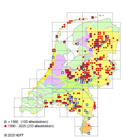 Het aantal atlasblokken (5x5 km) waarin de soort is gemeld binnen een periode van vijf jaar (vanaf 1980) of twintig jaar. Niet gecorrigeerd voor waarnemersinspanning en het aantal doorgegeven waarnemingen kan sterk variëren per periode, dus een trend in verspreiding kan hier niet direct uit worden afgelezen. Het opgegeven jaartal is het eerste jaar van de periode. Bron: gevalideerde waarnemingen uit de NDFF.