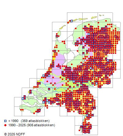 Het aantal atlasblokken (5x5 km) waarin de soort is gemeld binnen een periode van vijf jaar (vanaf 1980) of twintig jaar. Niet gecorrigeerd voor waarnemersinspanning en het aantal doorgegeven waarnemingen kan sterk variëren per periode, dus een trend in verspreiding kan hier niet direct uit worden afgelezen. Het opgegeven jaartal is het eerste jaar van de periode. Bron: gevalideerde waarnemingen uit de NDFF.