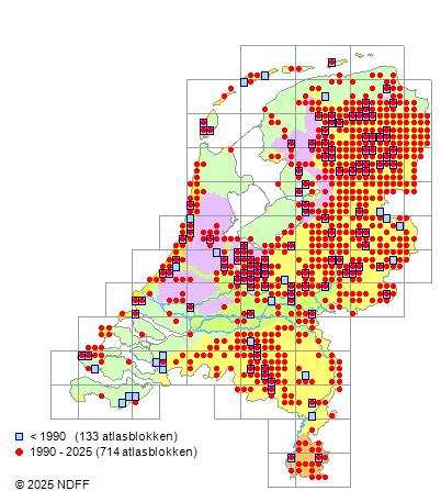 Het aantal atlasblokken (5x5 km) waarin de soort is gemeld binnen een periode van vijf jaar (vanaf 1980) of twintig jaar. Niet gecorrigeerd voor waarnemersinspanning en het aantal doorgegeven waarnemingen kan sterk variëren per periode, dus een trend in verspreiding kan hier niet direct uit worden afgelezen. Het opgegeven jaartal is het eerste jaar van de periode. Bron: gevalideerde waarnemingen uit de NDFF.