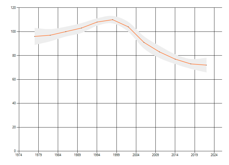 Gemiddelde trend van het aantal kilometerhokken waarin de soort voorkomt, weergegeven als indexcijfer (1975-1978 = 100).