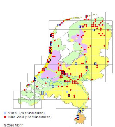 Het aantal atlasblokken (5x5 km) waarin de soort is gemeld binnen een periode van vijf jaar (vanaf 1980) of twintig jaar. Niet gecorrigeerd voor waarnemersinspanning en het aantal doorgegeven waarnemingen kan sterk variëren per periode, dus een trend in verspreiding kan hier niet direct uit worden afgelezen. Het opgegeven jaartal is het eerste jaar van de periode. Bron: gevalideerde waarnemingen uit de NDFF.