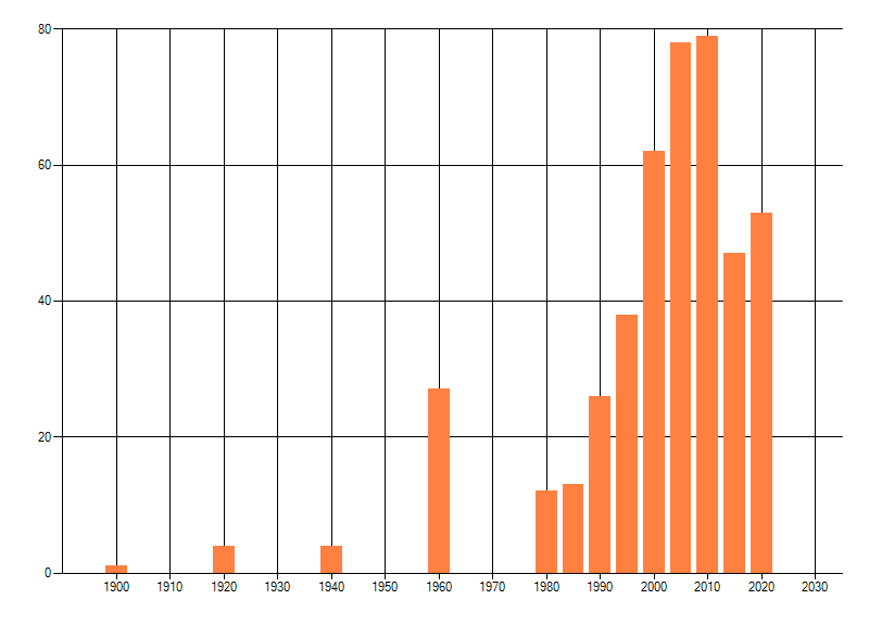 Het aantal atlasblokken (5x5 km) waarin de soort is gemeld binnen een periode van vijf jaar (vanaf 1980) of twintig jaar. Niet gecorrigeerd voor waarnemersinspanning en het aantal doorgegeven waarnemingen kan sterk variëren per periode, dus een trend in verspreiding kan hier niet direct uit worden afgelezen. Het opgegeven jaartal is het eerste jaar van de periode. Bron: gevalideerde waarnemingen uit de NDFF.