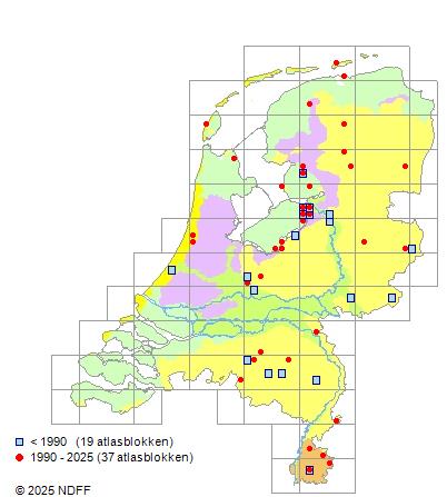 Het aantal atlasblokken (5x5 km) waarin de soort is gemeld binnen een periode van vijf jaar (vanaf 1980) of twintig jaar. Niet gecorrigeerd voor waarnemersinspanning en het aantal doorgegeven waarnemingen kan sterk variëren per periode, dus een trend in verspreiding kan hier niet direct uit worden afgelezen. Het opgegeven jaartal is het eerste jaar van de periode. Bron: gevalideerde waarnemingen uit de NDFF.
