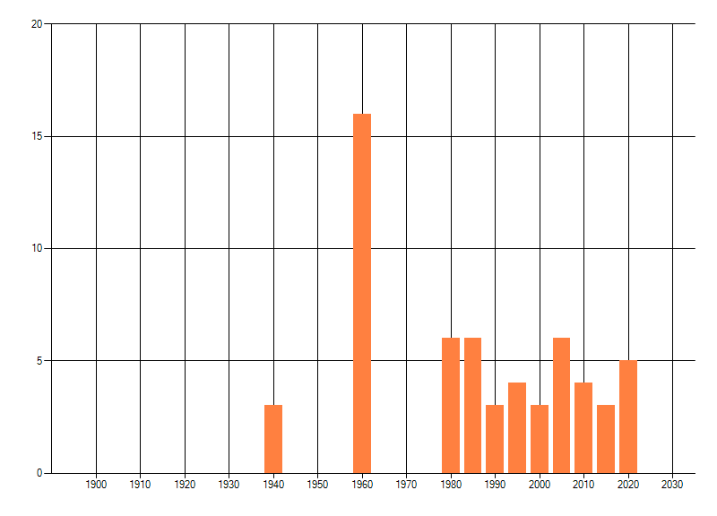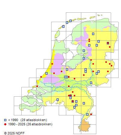 Het aantal atlasblokken (5x5 km) waarin de soort is gemeld binnen een periode van vijf jaar (vanaf 1980) of twintig jaar. Niet gecorrigeerd voor waarnemersinspanning en het aantal doorgegeven waarnemingen kan sterk variëren per periode, dus een trend in verspreiding kan hier niet direct uit worden afgelezen. Het opgegeven jaartal is het eerste jaar van de periode. Bron: gevalideerde waarnemingen uit de NDFF.
