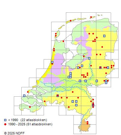 Het aantal atlasblokken (5x5 km) waarin de soort is gemeld binnen een periode van vijf jaar (vanaf 1980) of twintig jaar. Niet gecorrigeerd voor waarnemersinspanning en het aantal doorgegeven waarnemingen kan sterk variëren per periode, dus een trend in verspreiding kan hier niet direct uit worden afgelezen. Het opgegeven jaartal is het eerste jaar van de periode. Bron: gevalideerde waarnemingen uit de NDFF.