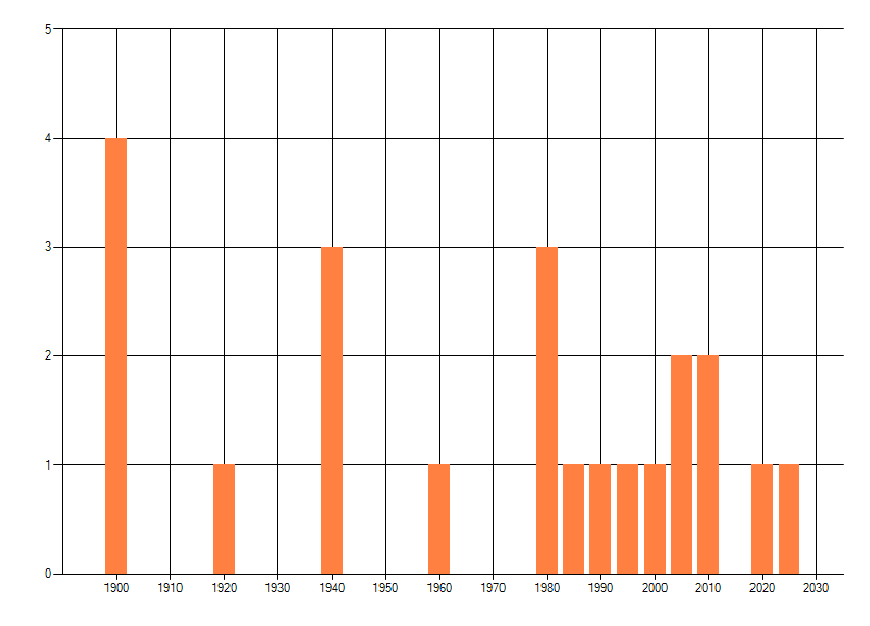 Het aantal atlasblokken (5x5 km) waarin de soort is gemeld binnen een periode van vijf jaar (vanaf 1980) of twintig jaar. Niet gecorrigeerd voor waarnemersinspanning en het aantal doorgegeven waarnemingen kan sterk variëren per periode, dus een trend in verspreiding kan hier niet direct uit worden afgelezen. Het opgegeven jaartal is het eerste jaar van de periode. Bron: gevalideerde waarnemingen uit de NDFF.