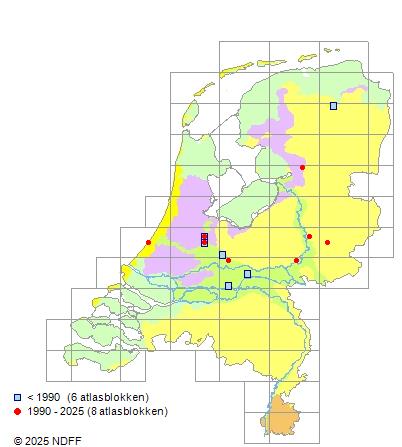 Het aantal atlasblokken (5x5 km) waarin de soort is gemeld binnen een periode van vijf jaar (vanaf 1980) of twintig jaar. Niet gecorrigeerd voor waarnemersinspanning en het aantal doorgegeven waarnemingen kan sterk variëren per periode, dus een trend in verspreiding kan hier niet direct uit worden afgelezen. Het opgegeven jaartal is het eerste jaar van de periode. Bron: gevalideerde waarnemingen uit de NDFF.